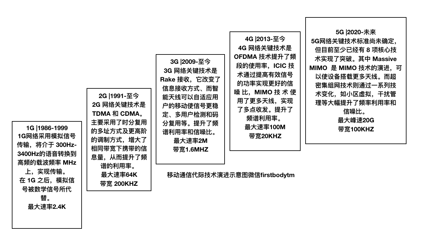 下图可见从1G到5G,每一代通信网络的发展都是综合多种技术协同产生的进步。