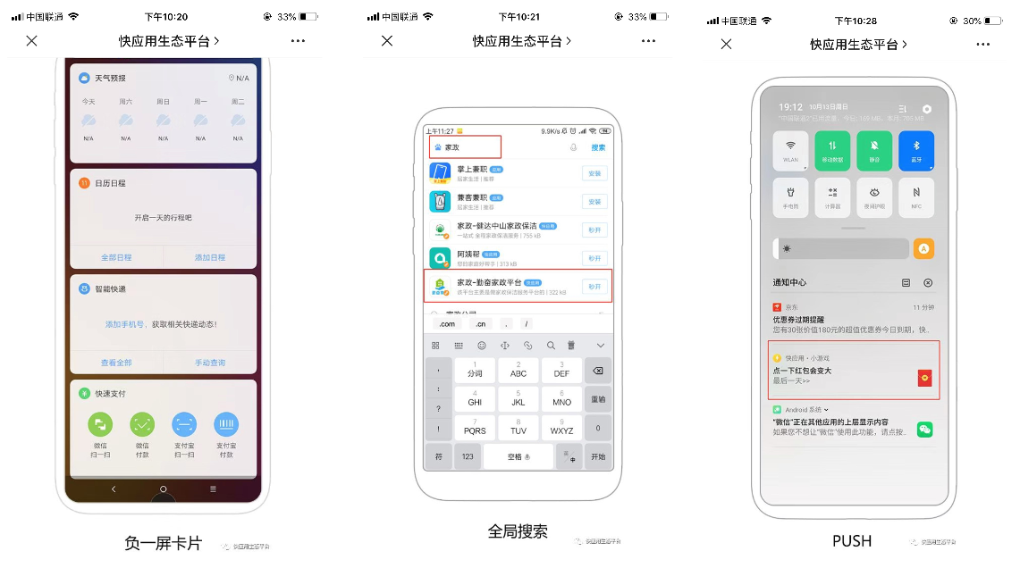 快应用作为一个基于手机系统端的“小程序”,具有“无需安装、即点即用”的特点。试想一下,当如今一个APP用户获客成本高昂的情况下,如果和手机厂商合作,用更低的成本,就可以在手机负一屏,全局搜索等智能手机关键场景上布局和引流,以低价易触达的方式让用户体验类似APP的内容和功能,并且引导用户进行业务转化,何乐而不为呢?