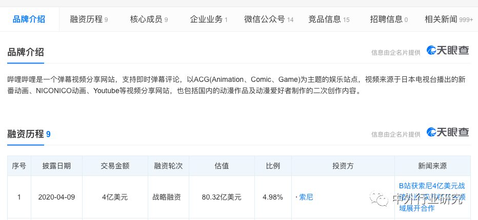 天眼查APP显示,哔哩哔哩是一个弹幕视频分享网站,支持即时弹幕评论,以ACG(Animation、Comic、Game)为主题的娱乐站点,视频来源于日本电视台播出的新番动画、NICONICO动画、Youtube等视频分享网站,也包括国内的动漫作品及动漫爱好者制作的二次创作内容。