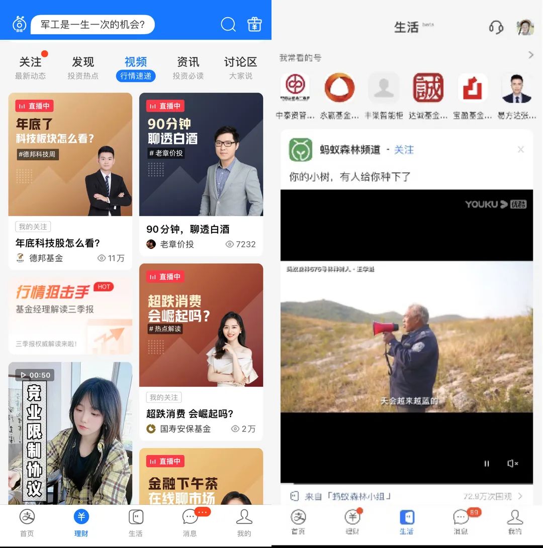 今年以来,蚂蚁财富不断加码短视频的运营。目前支付宝已经在财富页面设置视频栏目,并且开启了短视频的灰度测试,视频内容被放在一级入口,可直接从切换底部菜单栏进入,视频流量将会大大提升。除此之外,天天基金、招商银行等各大头部代销平台均支持视频发布。可见,视频运营或将复制财富直播的路径,线上渠道正在逐步推动资管机构产出短视频内容。