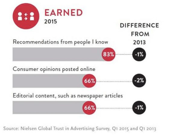 Nielsen2015年的全球广告信任度调查报告显示,83%的消费者信任朋友和家人的推荐,这是典型的口碑营销的作用。