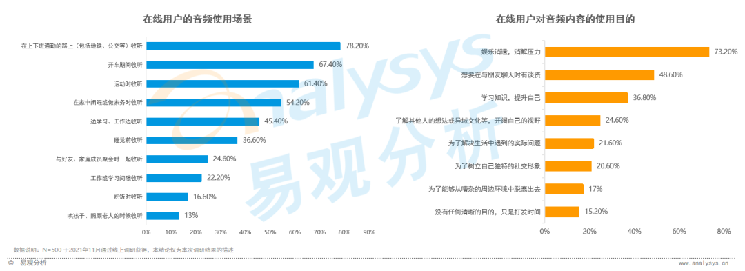 娱乐、社交、学习是在线用户收听音频内容最为主流的目的,73%的用户认为音频内容是娱乐消遣的重要工具,将近50%的用户是为了日后在与朋友聊天时有谈资,36%的用户会通过音频来学习知识。