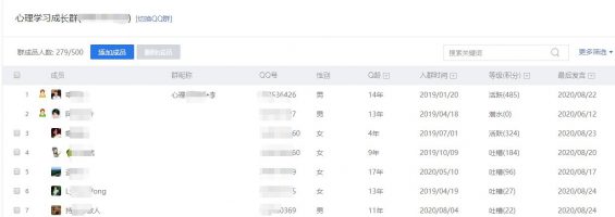 可看到该群所有人的昵称、群名片、QQ号、性别、Q龄、入群时间、品级积分、最后讲话时间。