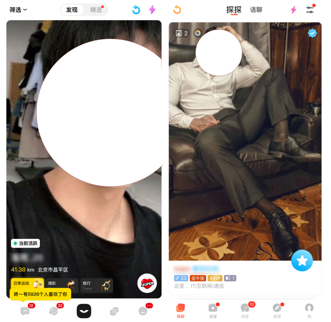 探探、积目代表的颜值交友软件里,男性和女性身处相互凝视、彼此“讨好”的状态。用户为获得更多注意,会通过模仿、学习、编造来重塑社交软件里的自我形象。